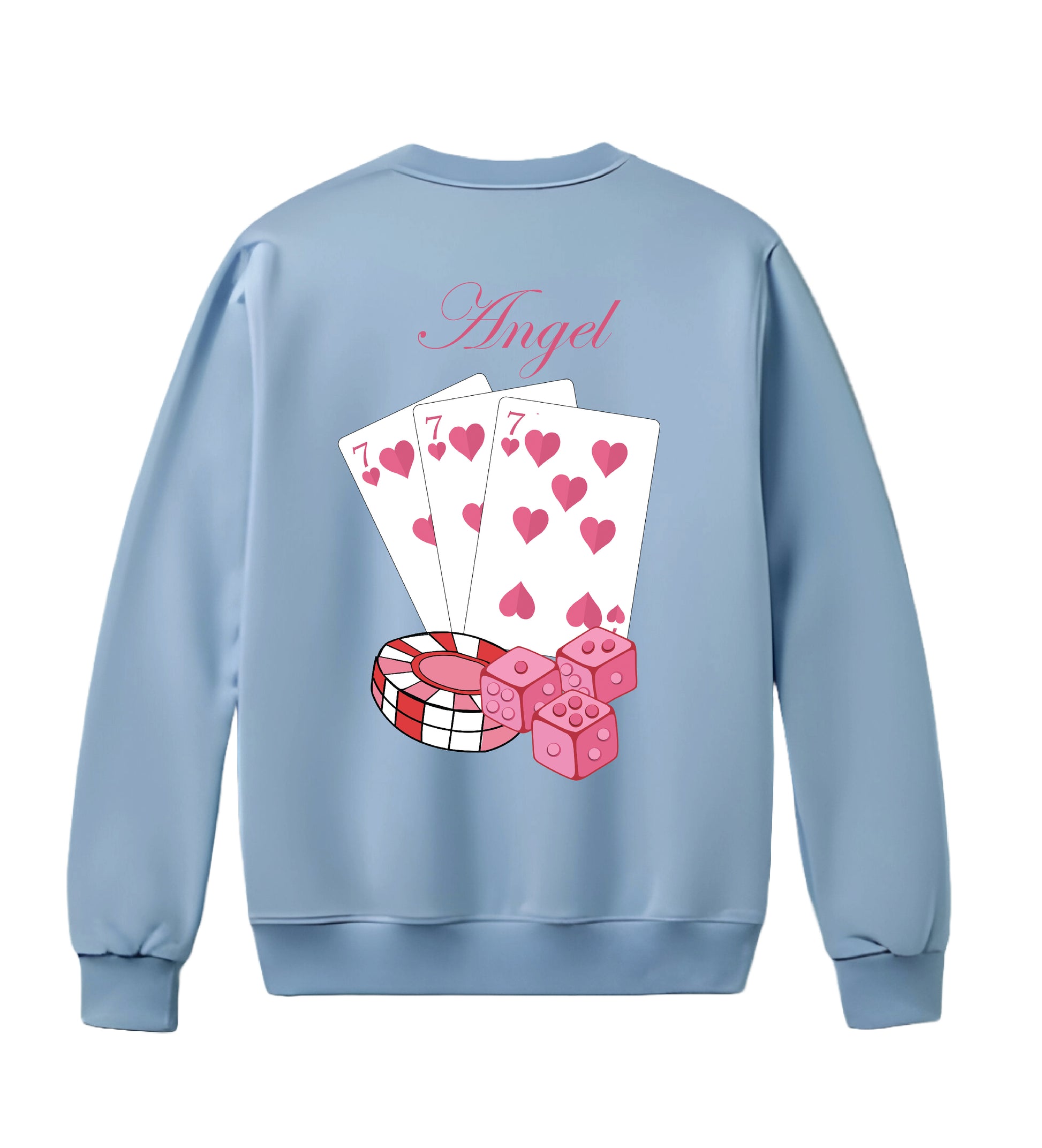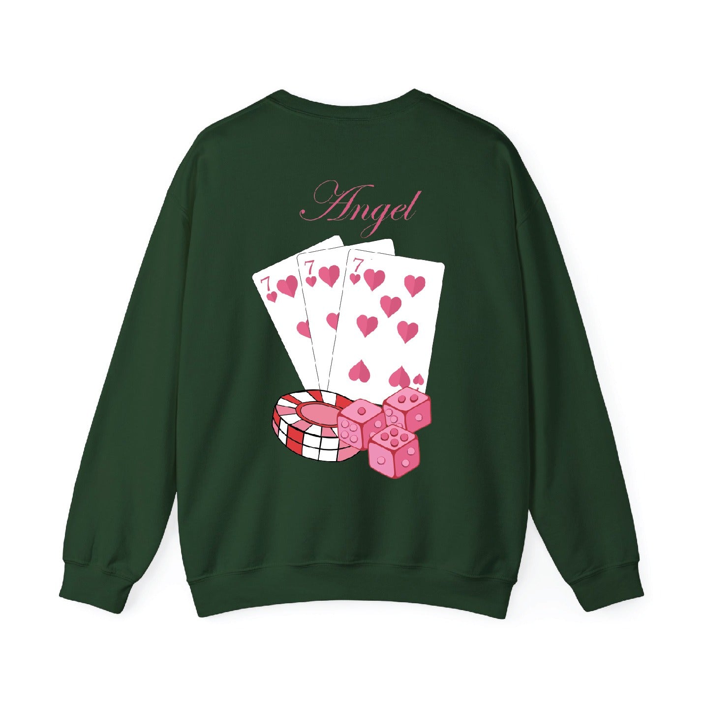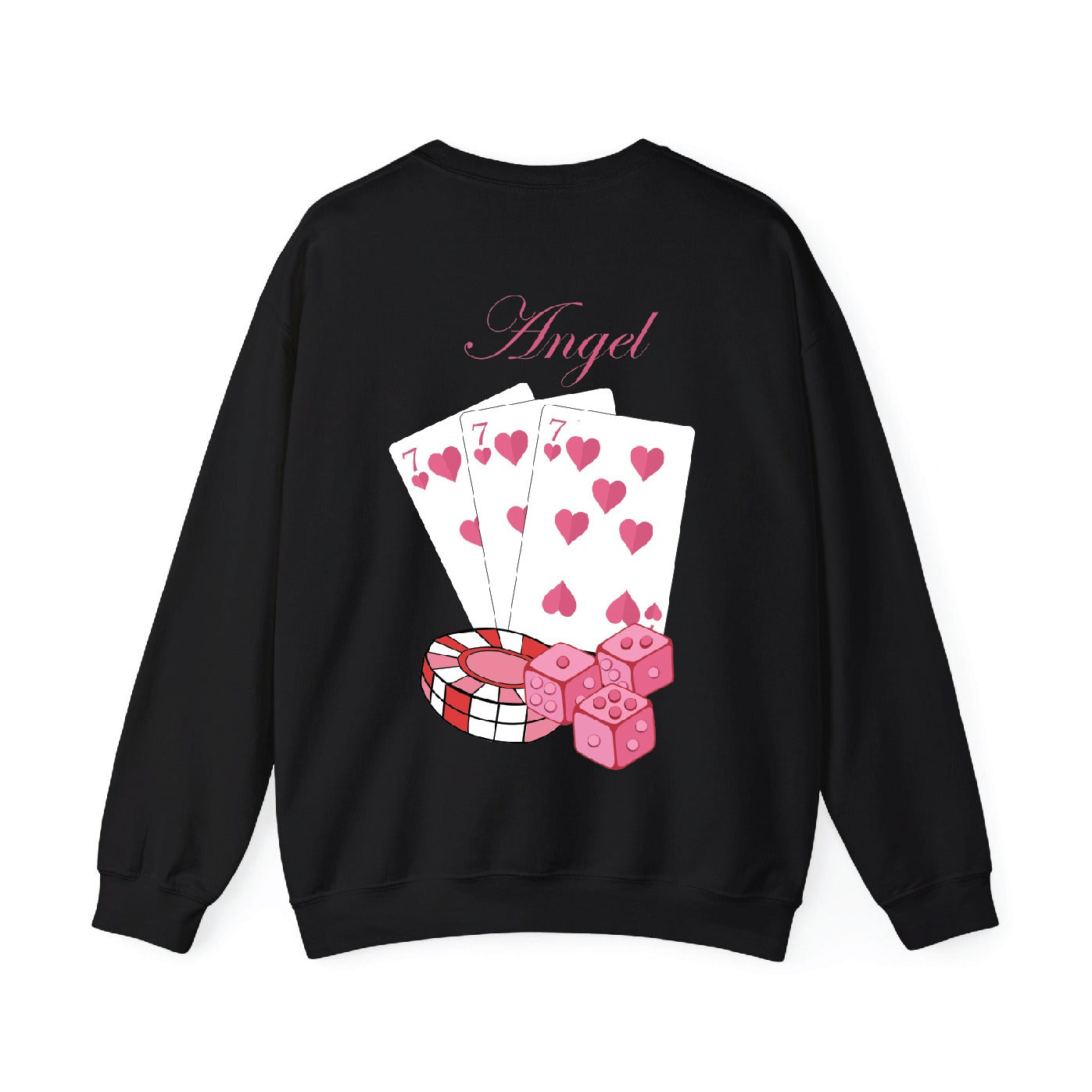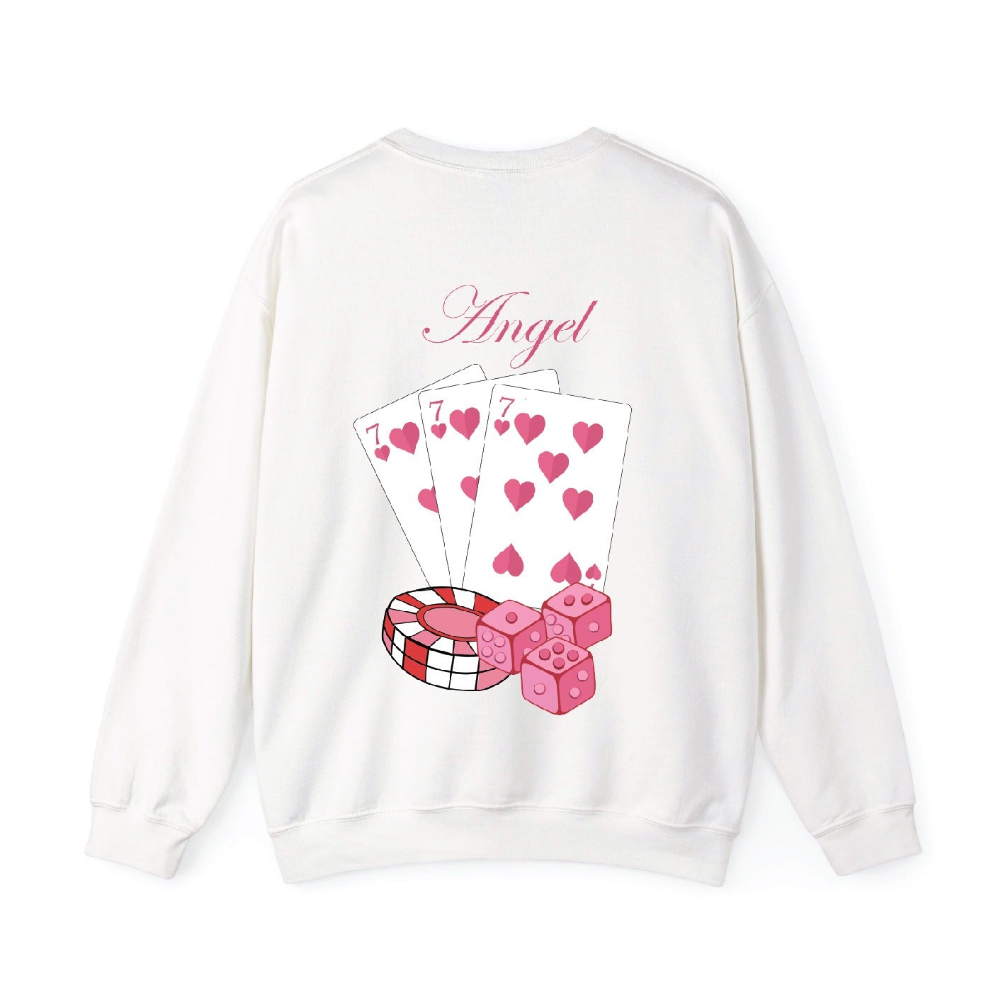 Feeling lucky? π The Angel Lucky Sweatshirt is your new go-to for bold, playful style with a touch of charm and mystery. Featuring a clean front design with stacked dice π² and a stunning back graphic of heart-filled playing cards π, chips, and the elegant word "Angel" in cursive β this sweatshirt says winner from every angle! ππΈ